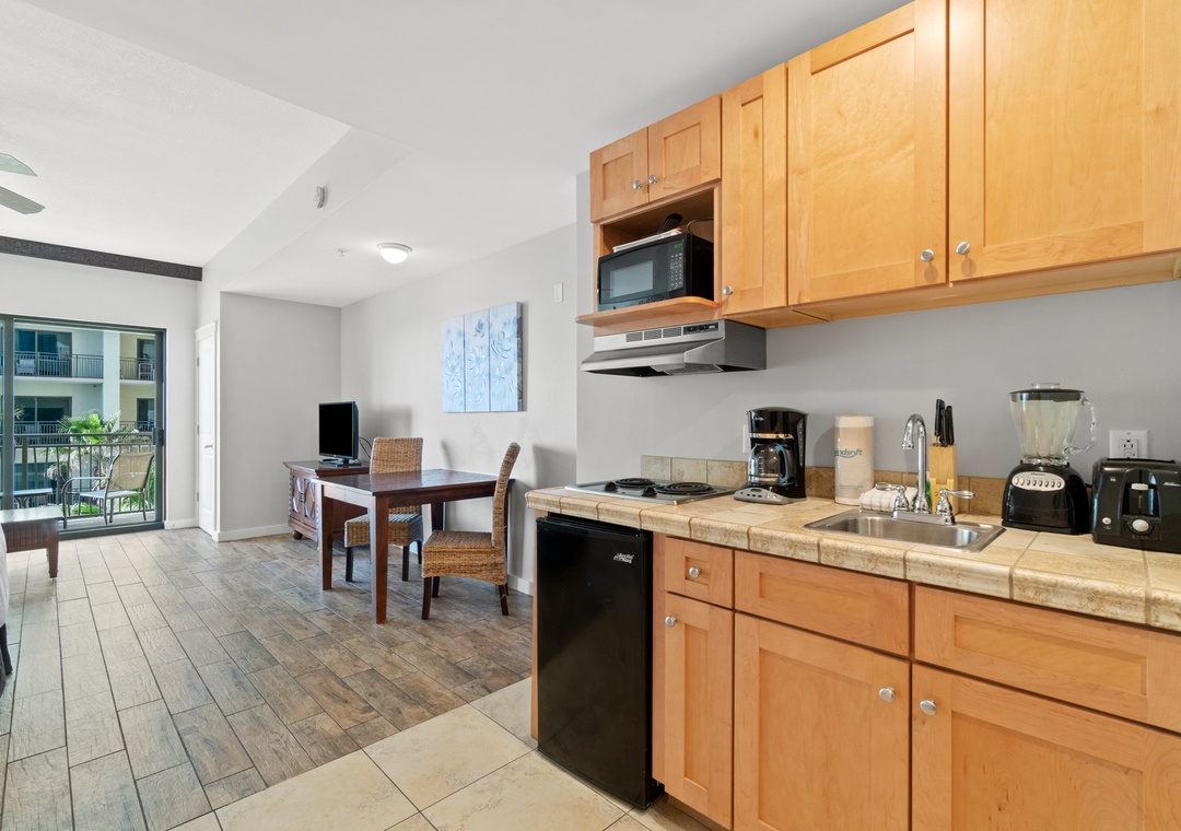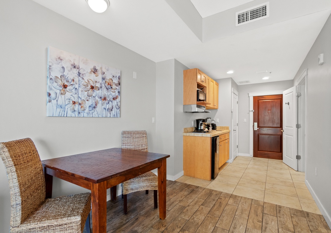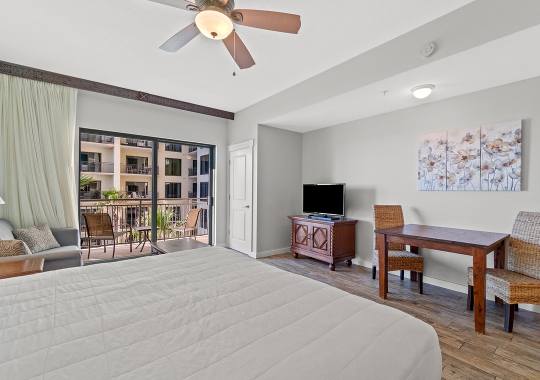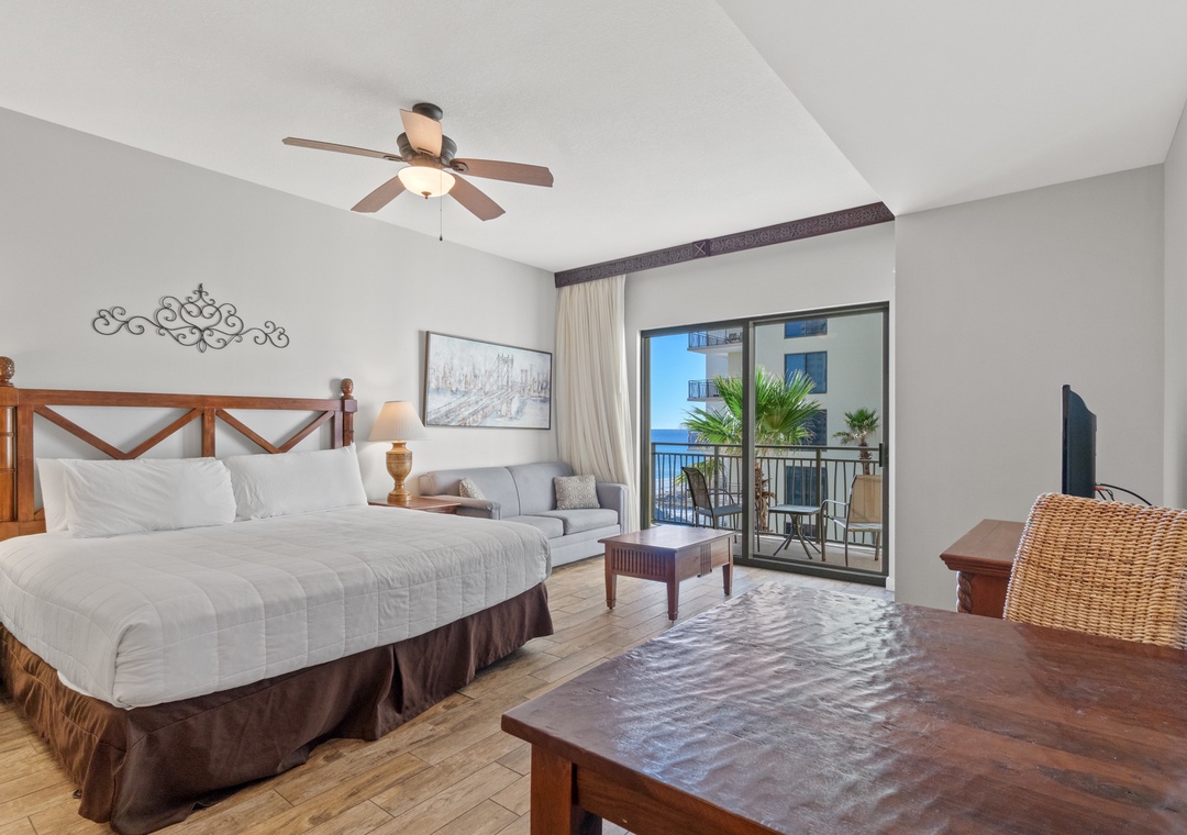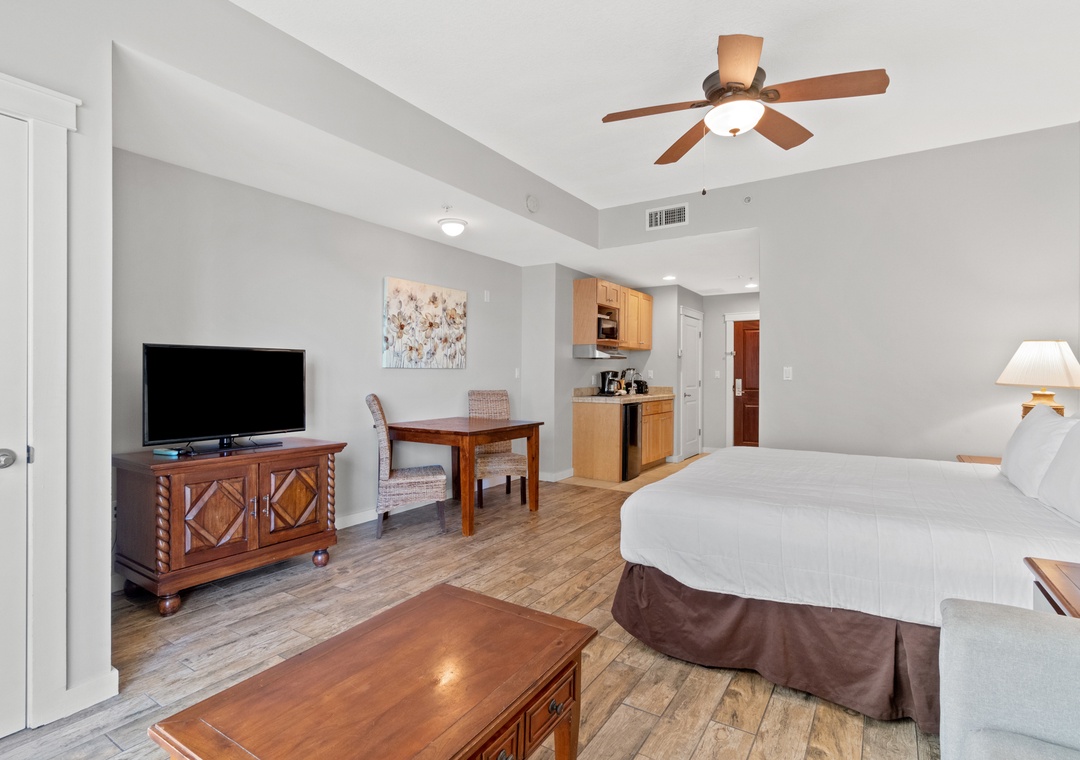 Studio King condo units include one king bed, a pull-out sofa sleeper, a living and dining area with a mini-refrigerator, microwave, sink, coffee maker, 1-flat-screen TV, 1-full bath, as well as private beach access and covered parking.
