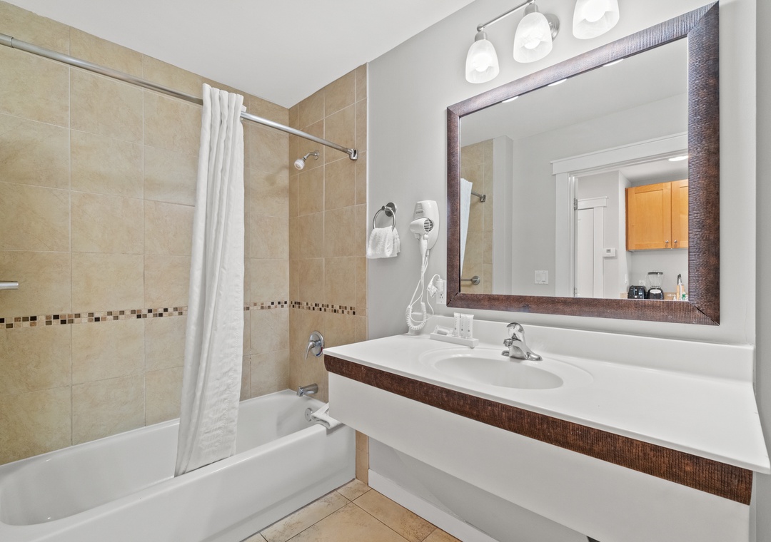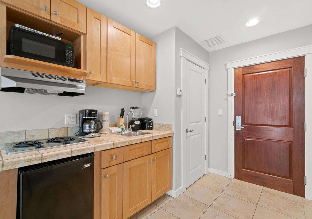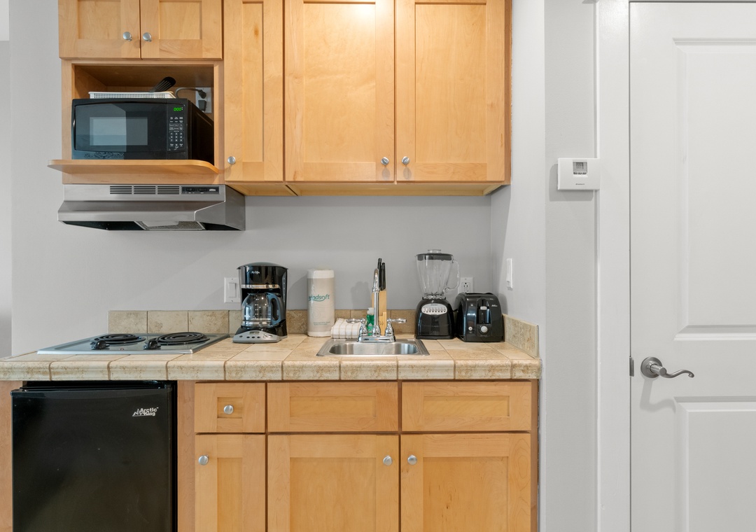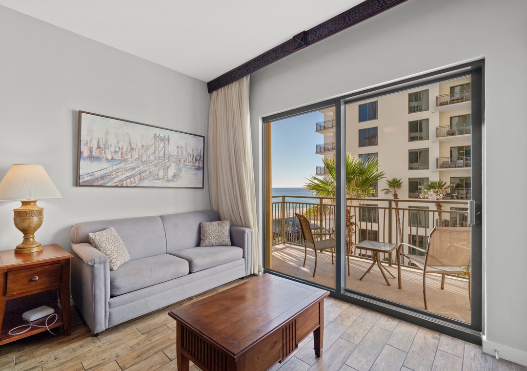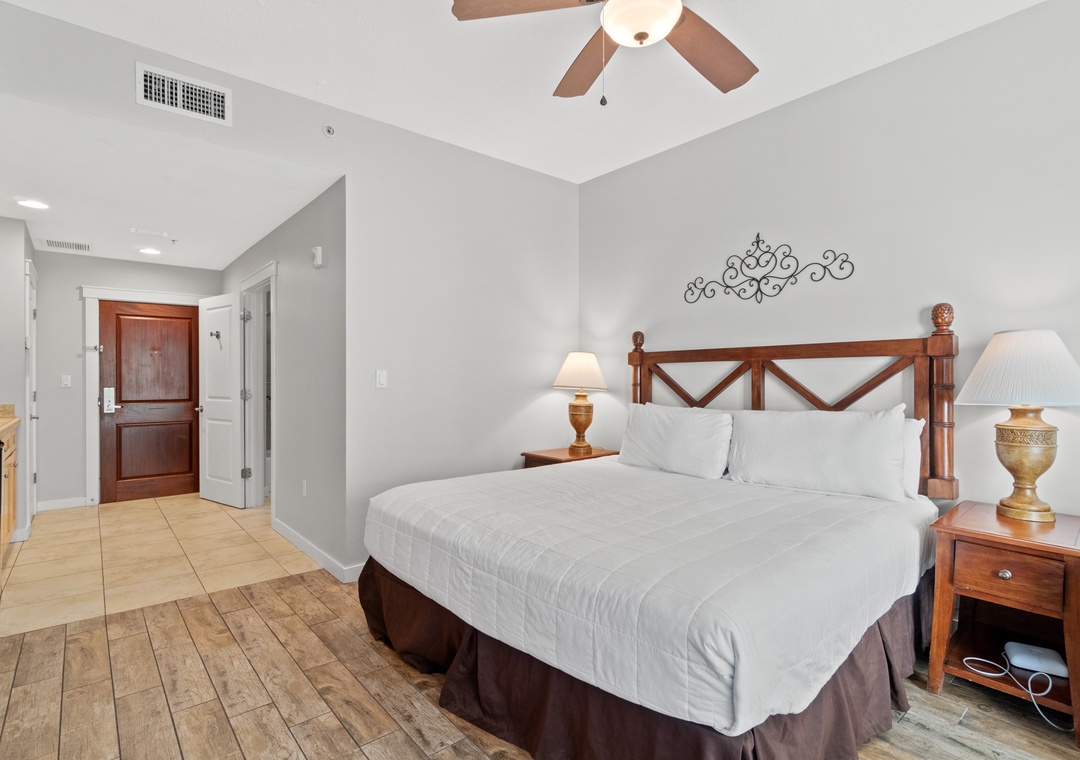 Studio King condo units include one king bed, a pull-out sofa sleeper, a living and dining area with a mini-refrigerator, microwave, sink, coffee maker, 1-flat-screen TV, 1-full bath, as well as private beach access and covered parking.