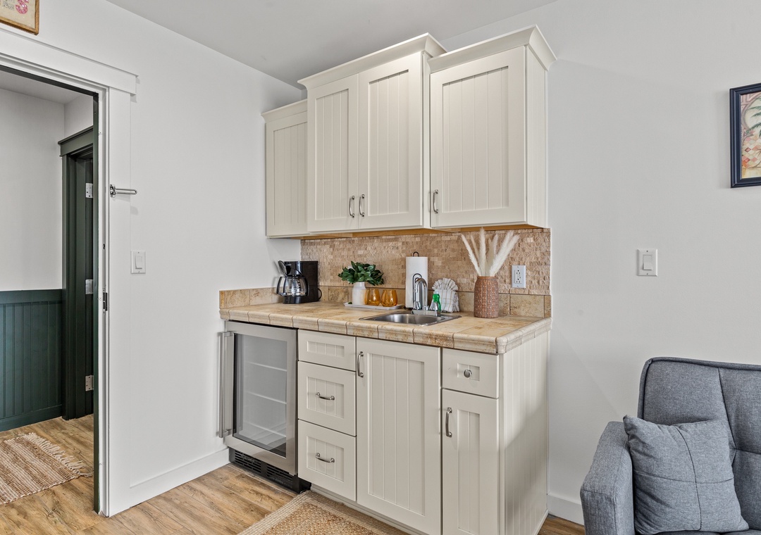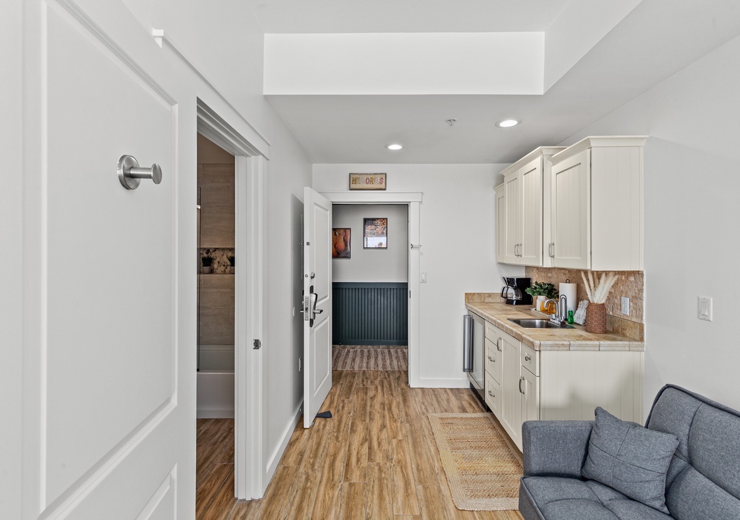 This stylish and updated unit will sleep up to 3-guests with 1-king bed, a futon,1-bath with a full-size tub and shower, a mini refrigerator, microwave, kitchen sink, coffee maker, and 1-flat screen tv.