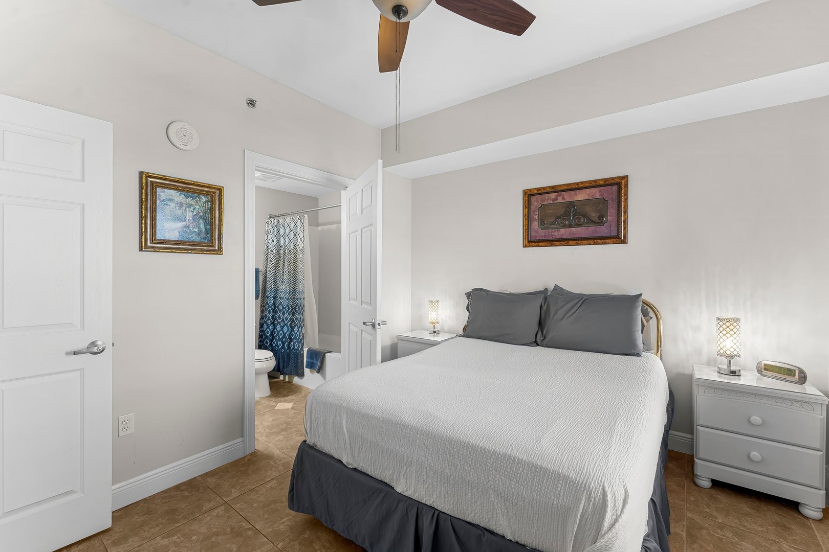 The open floor plan includes two bedrooms: a king bed in the master bedroom and a queen bed in the second bedroom. There's also a queen sleeper sofa in the living room. The first bathroom has a tub and shower combo, while the master bathroom features a walk-in shower and a lovely soaker tub for all your relaxation needs.