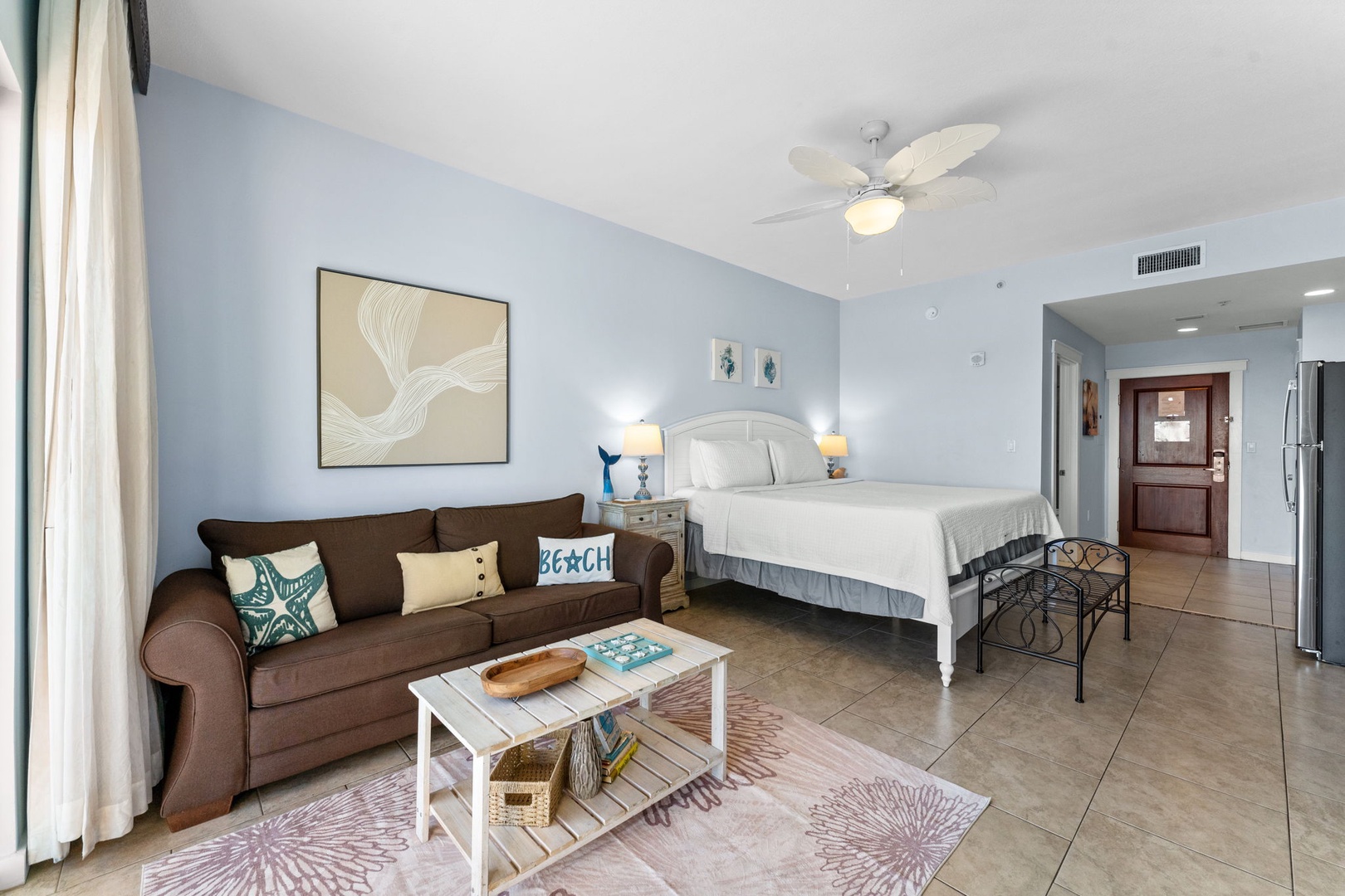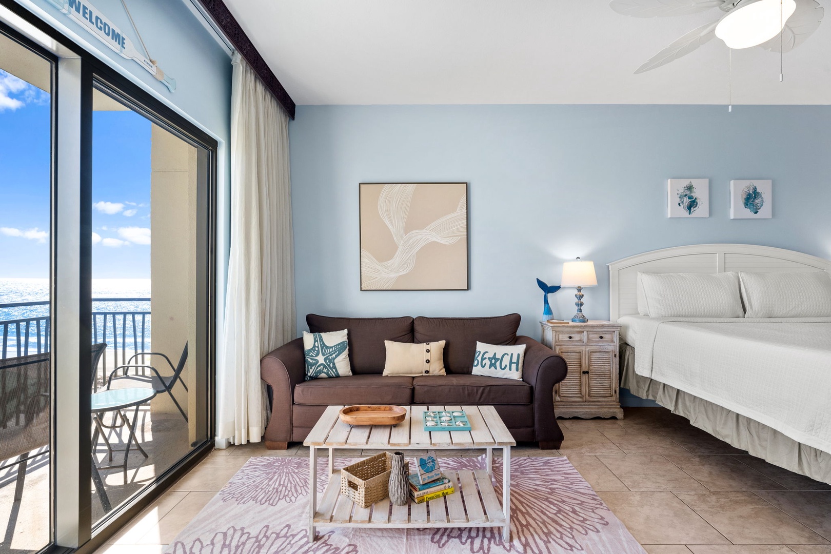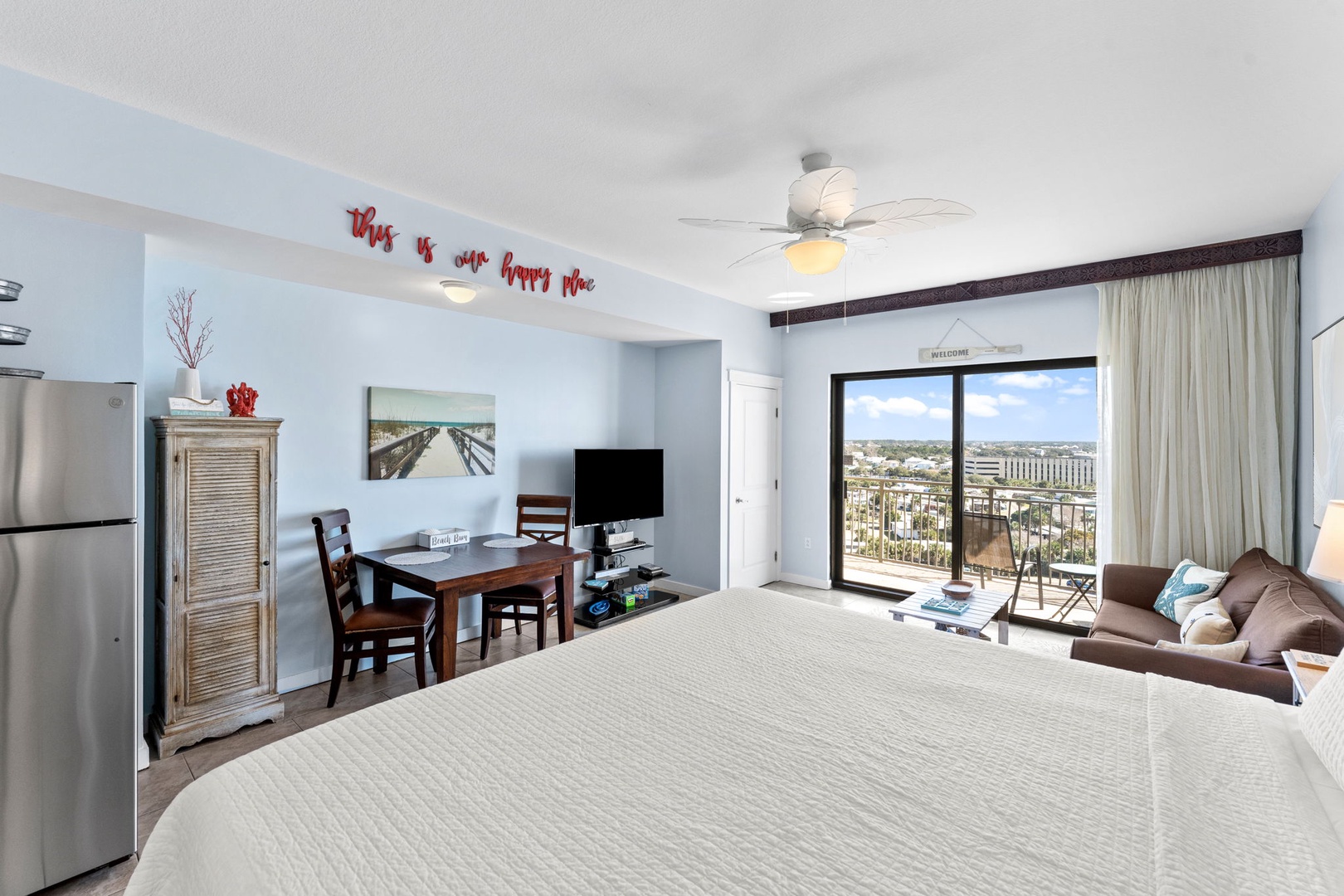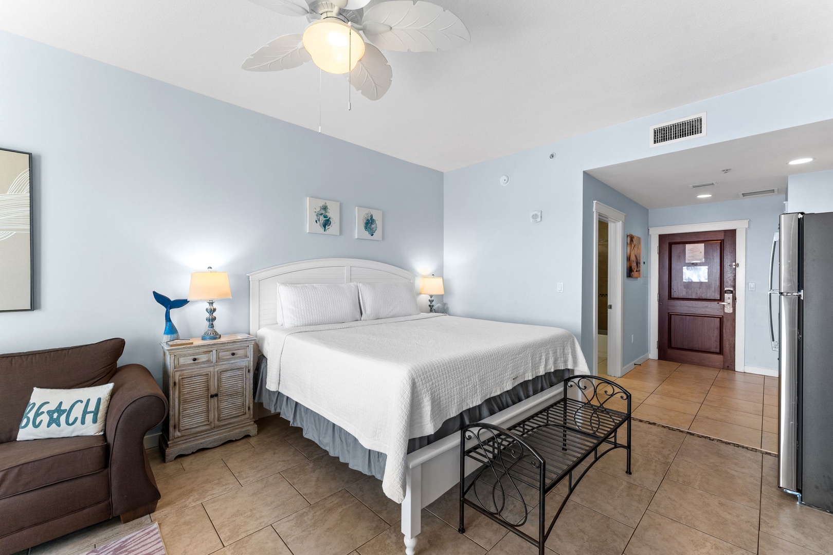 Studio King condo units include one king bed, a pull-out sofa sleeper, a living and dining area with a mini-refrigerator, microwave, sink, coffee maker, 1-flat-screen TV, 1-full bath, as well as private beach access and covered parking.