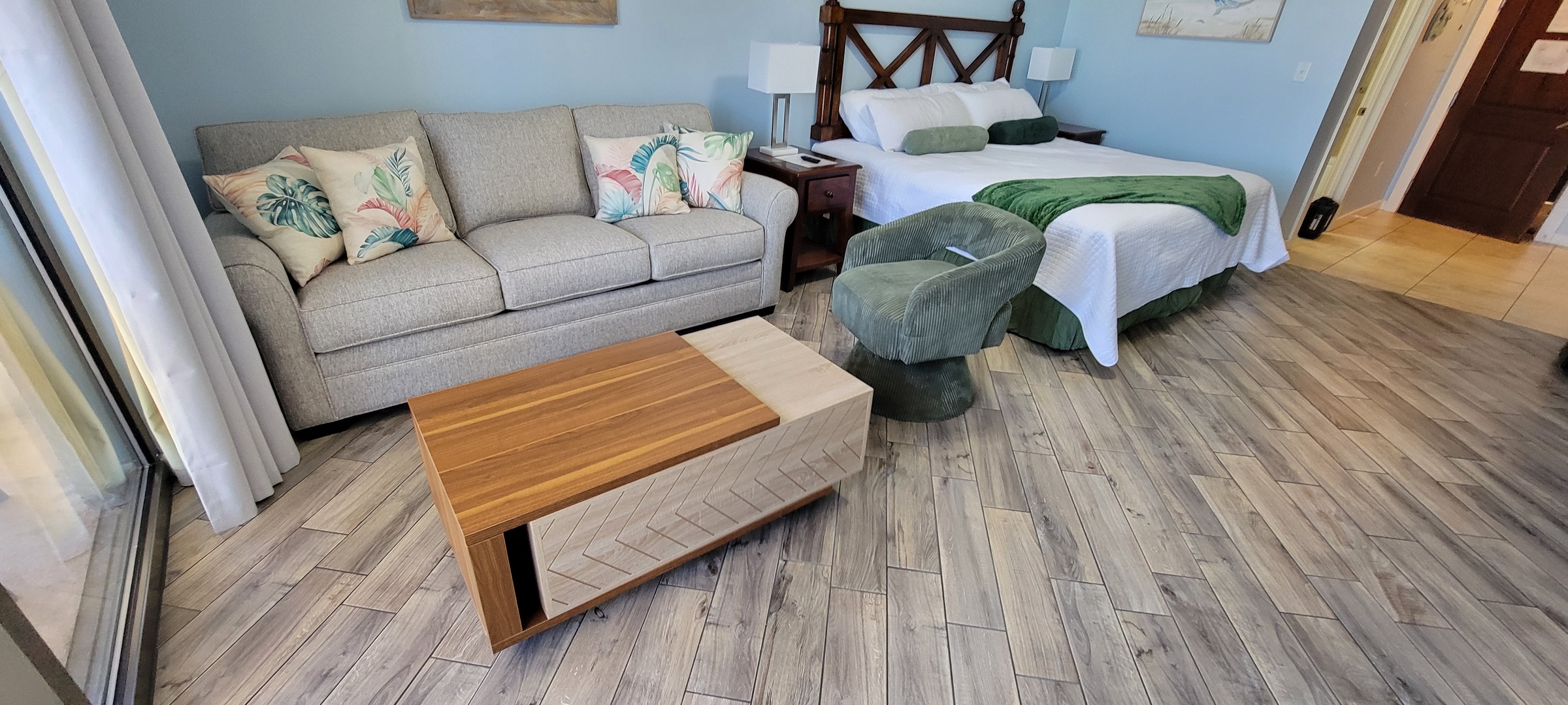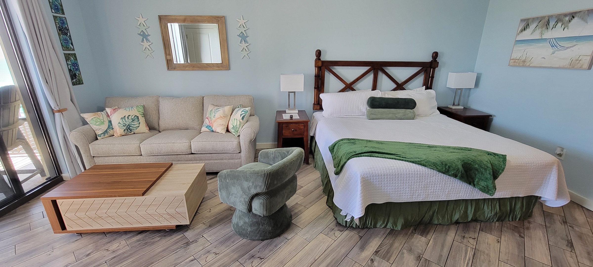 Studio King condo units include one king bed, a pull-out sofa sleeper, a living and dining area with a FULL size - refrigerator, dishwasher, microwave, sink, coffee maker, 1-flat-screen TV, 1-full bath, as well as private beach access and covered parking.