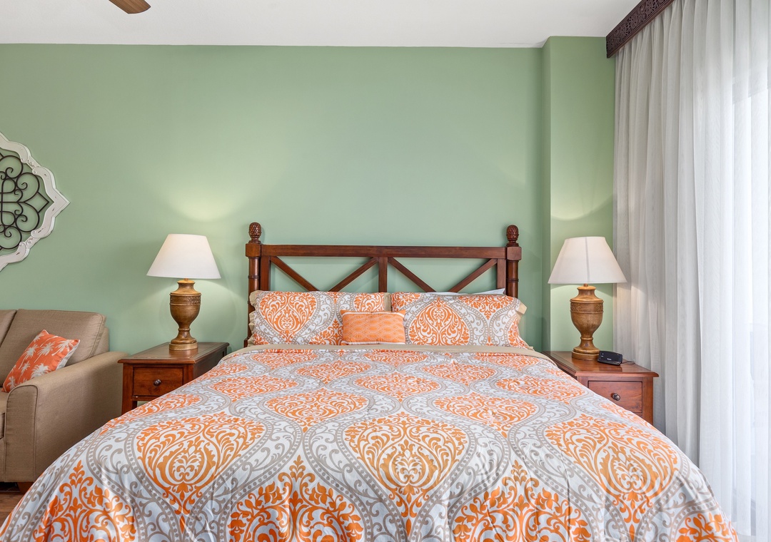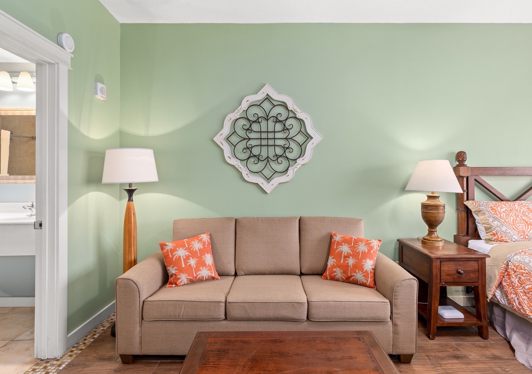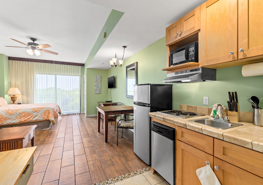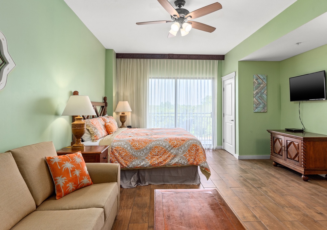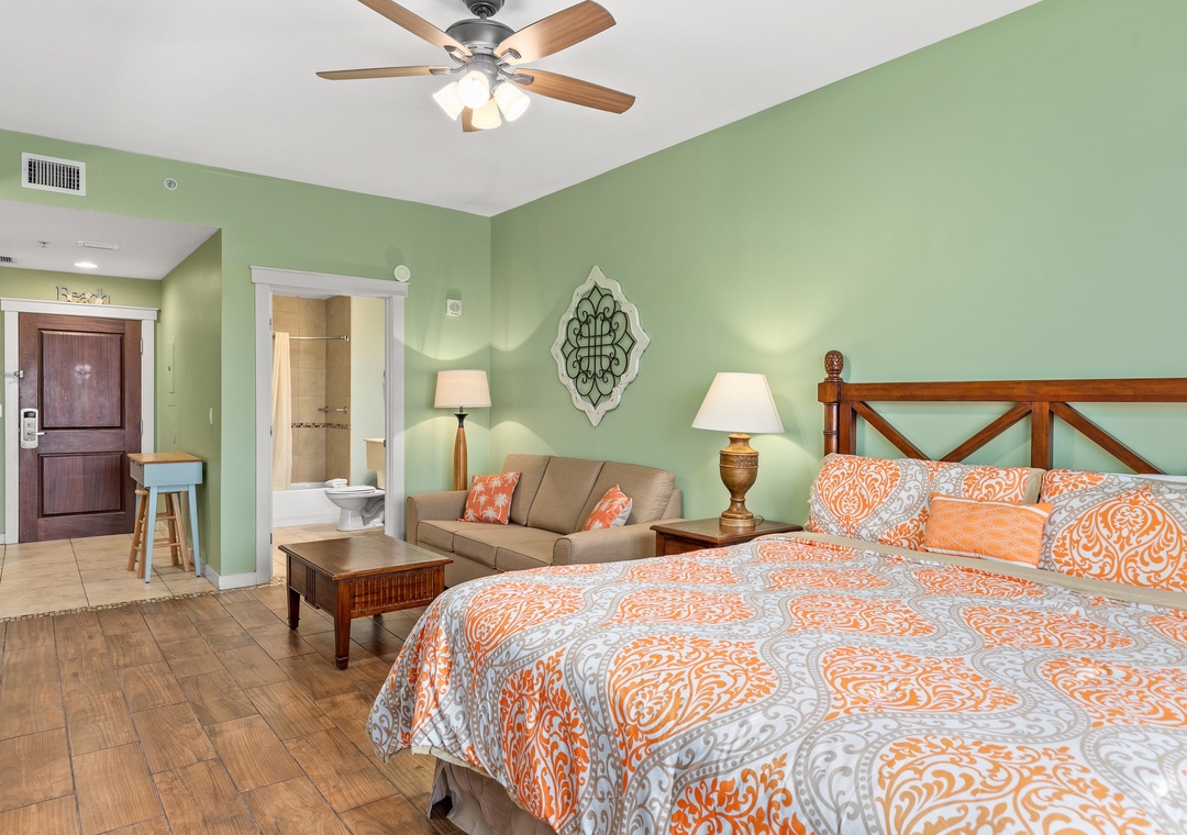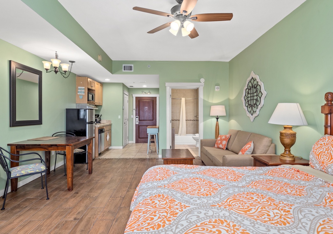 Studio King condo units include one king bed, a pull-out sofa sleeper, a living and dining area with a mini-refrigerator, microwave, sink, coffee maker, 1-flat-screen TV, 1-full bath, as well as private beach access and covered parking.