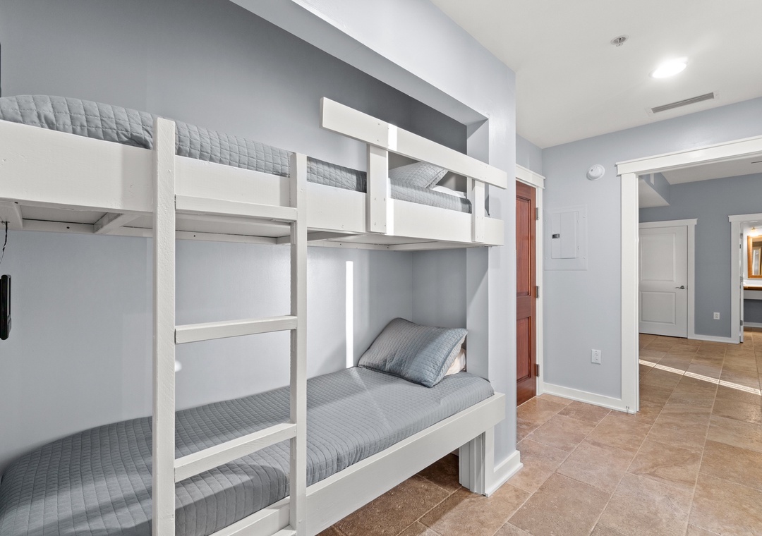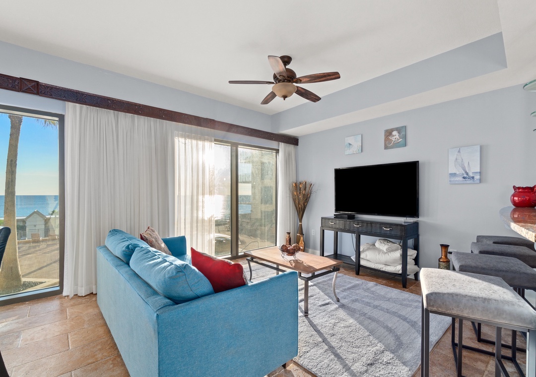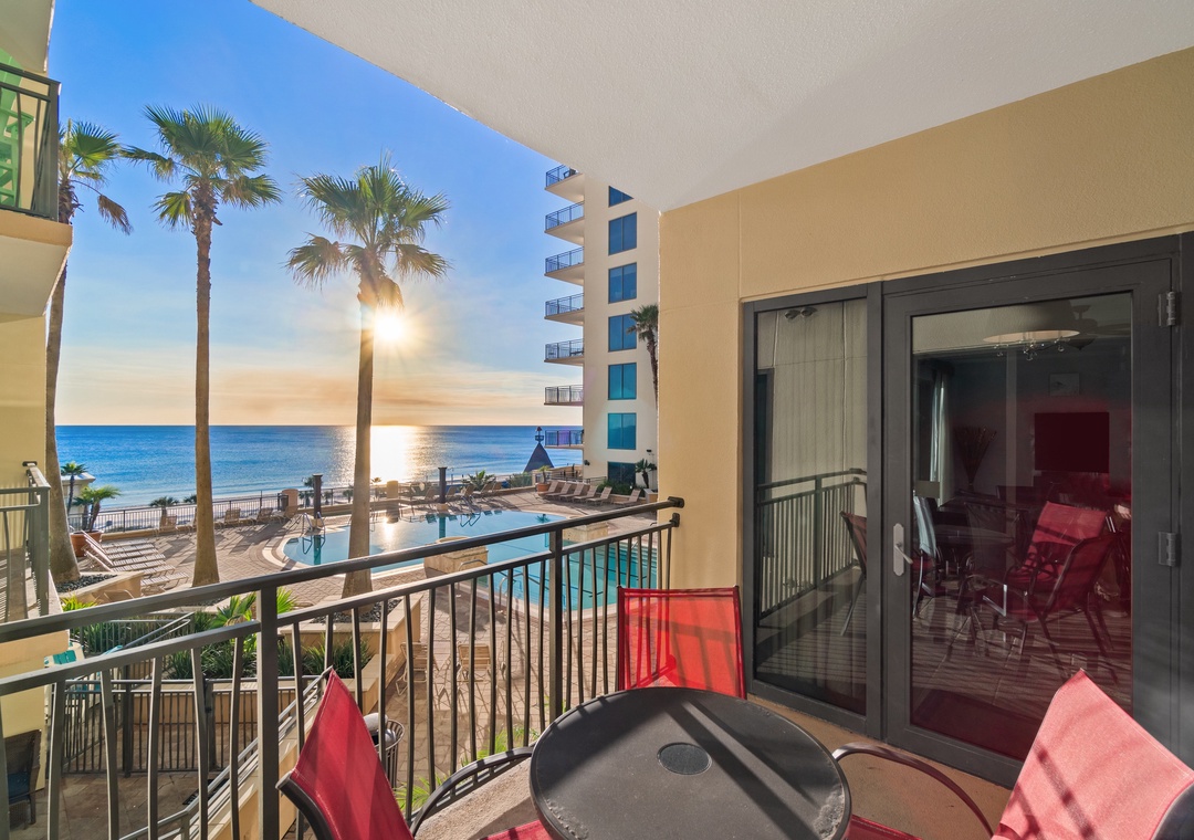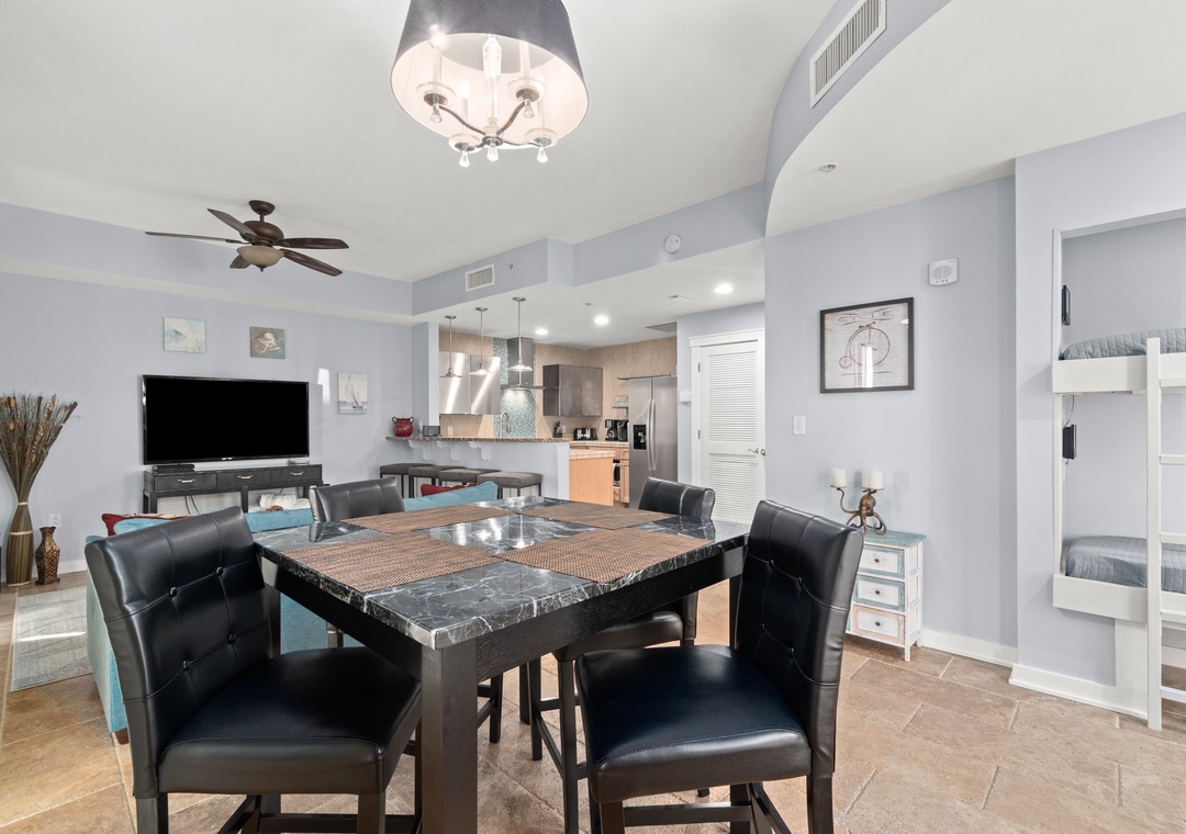 Nothing but beautiful beach views here! Relax and unwind in the heated swimming pool or the relaxing hot tub. Listen to the sounds of the Gulf of Mexico each morning from your private balcony and soak in the sunshine while you watch breath taking sunsets at this 5th floor 1- bedroom condo. This unique 1bedroom condo give families a living space to relax while little ones nap behind a closed door. Sleeps up to 6-guests with a king bed, sofa sleeper, and BUNK BEDS (twin over twin). Unit 524 has 2-TV’s, and is fully equipped with household essentials like basic cookware, and linens. This unit is unique in that it has a twin over twin bunk located in the common area, great for kiddos!