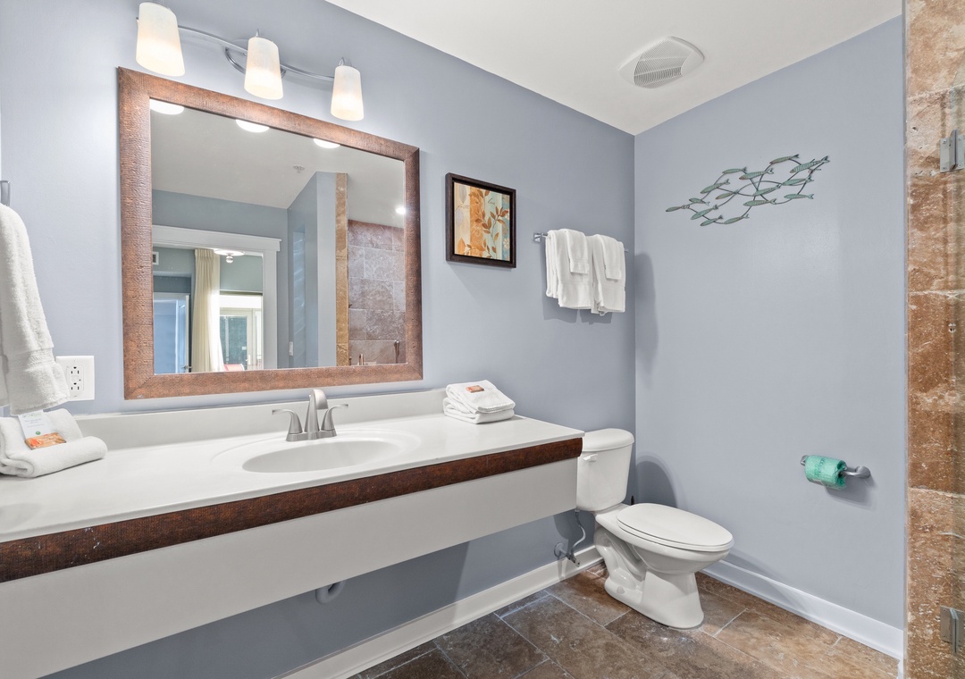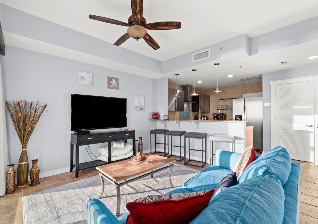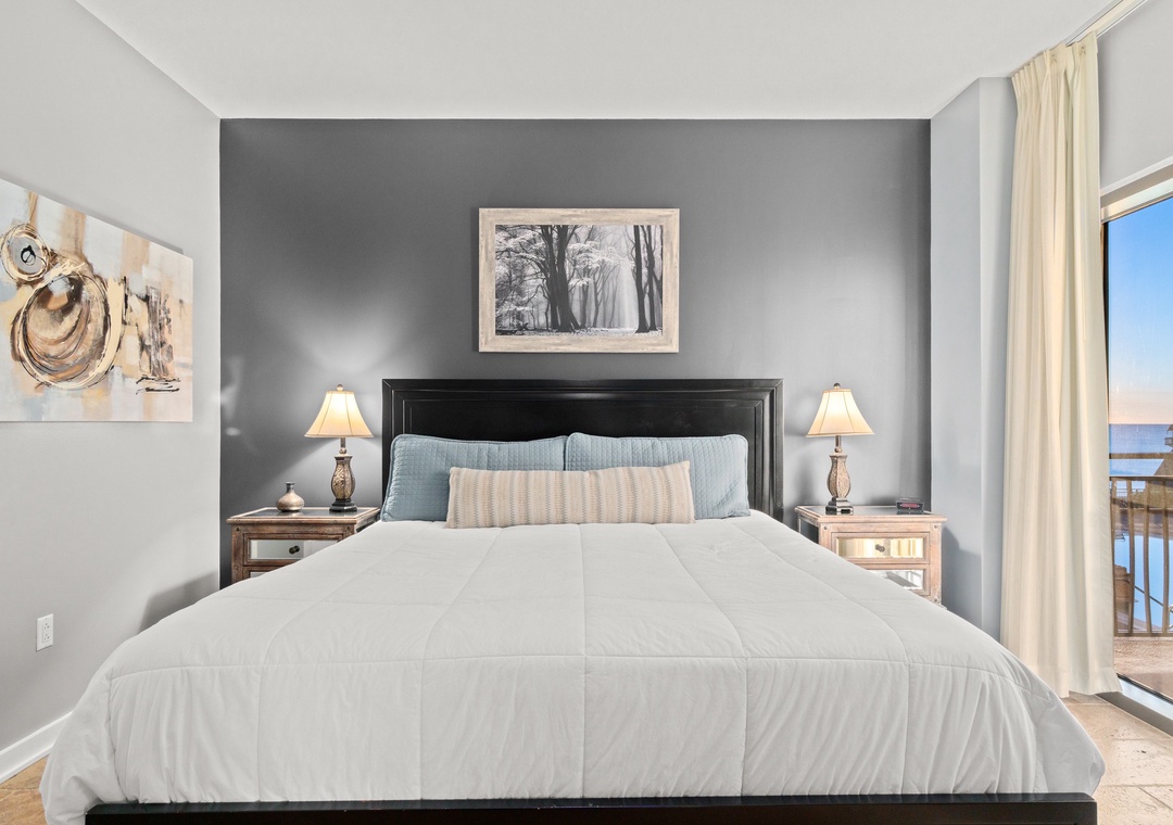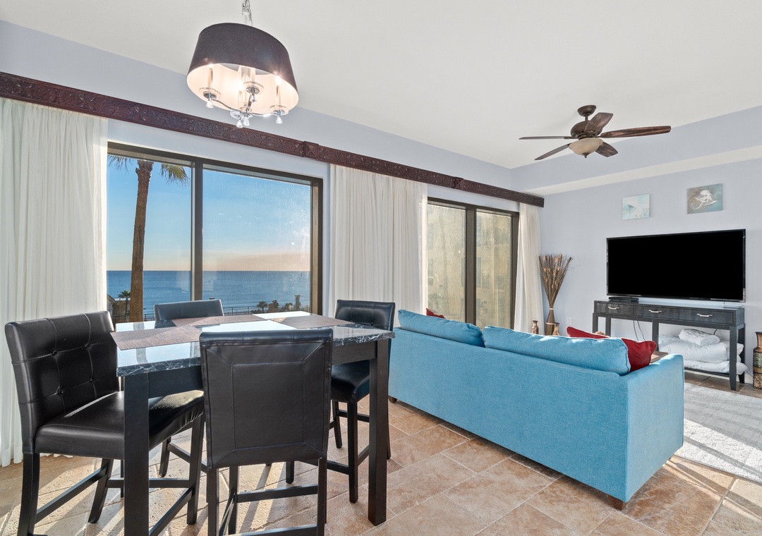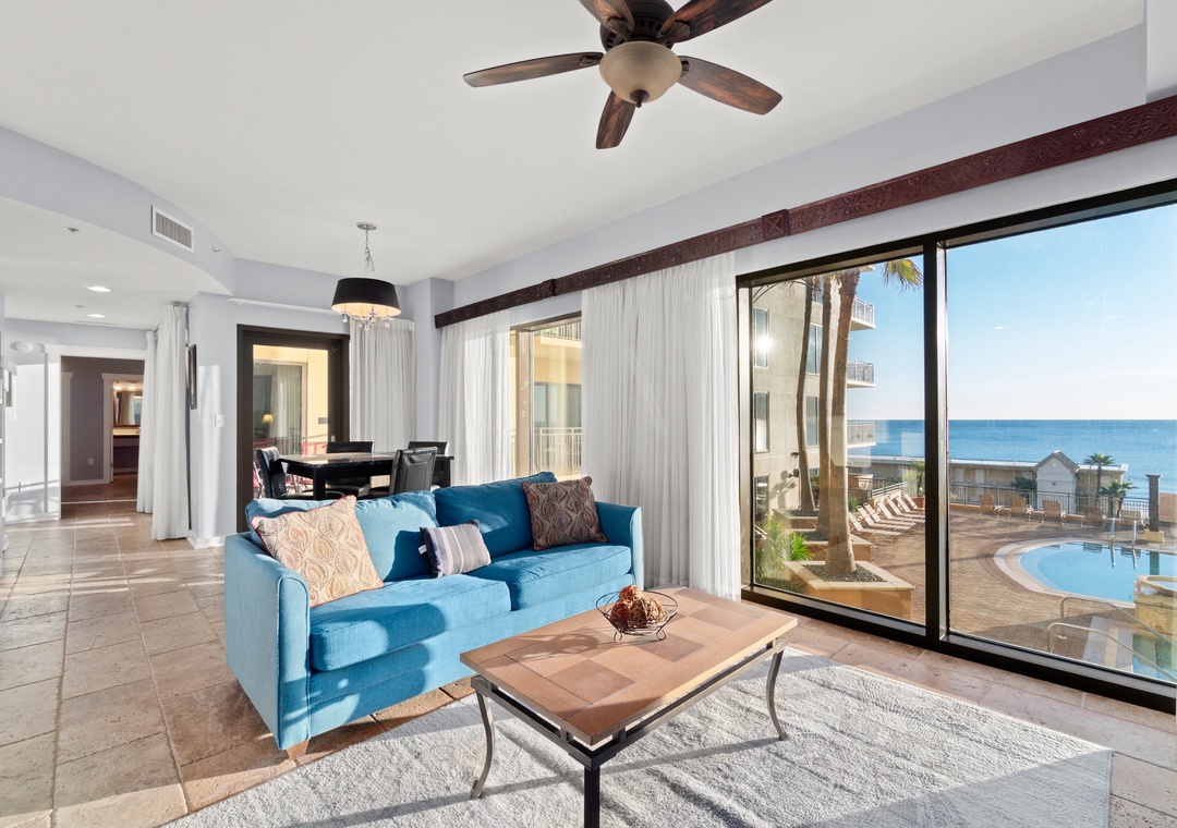 Nothing but beautiful beach views here! Relax and unwind in the heated swimming pool or the relaxing hot tub. Listen to the sounds of the Gulf of Mexico each morning from your private balcony and soak in the sunshine while you watch breath taking sunsets at this 5th floor 1- bedroom condo. This unique 1bedroom condo give families a living space to relax while little ones nap behind a closed door. Sleeps up to 6-guests with a king bed, sofa sleeper, and BUNK BEDS (twin over twin). Unit 524 has 2-TV’s, and is fully equipped with household essentials like basic cookware, and linens. This unit is unique in that it has a twin over twin bunk located in the common area, great for kiddos!