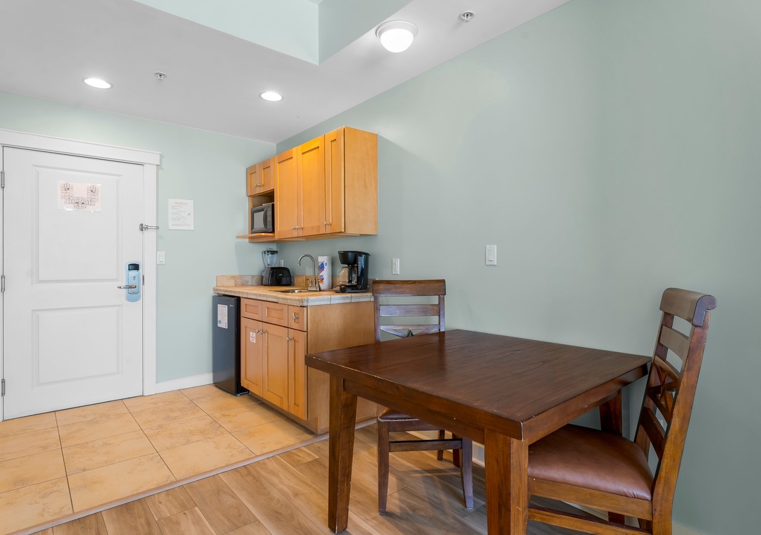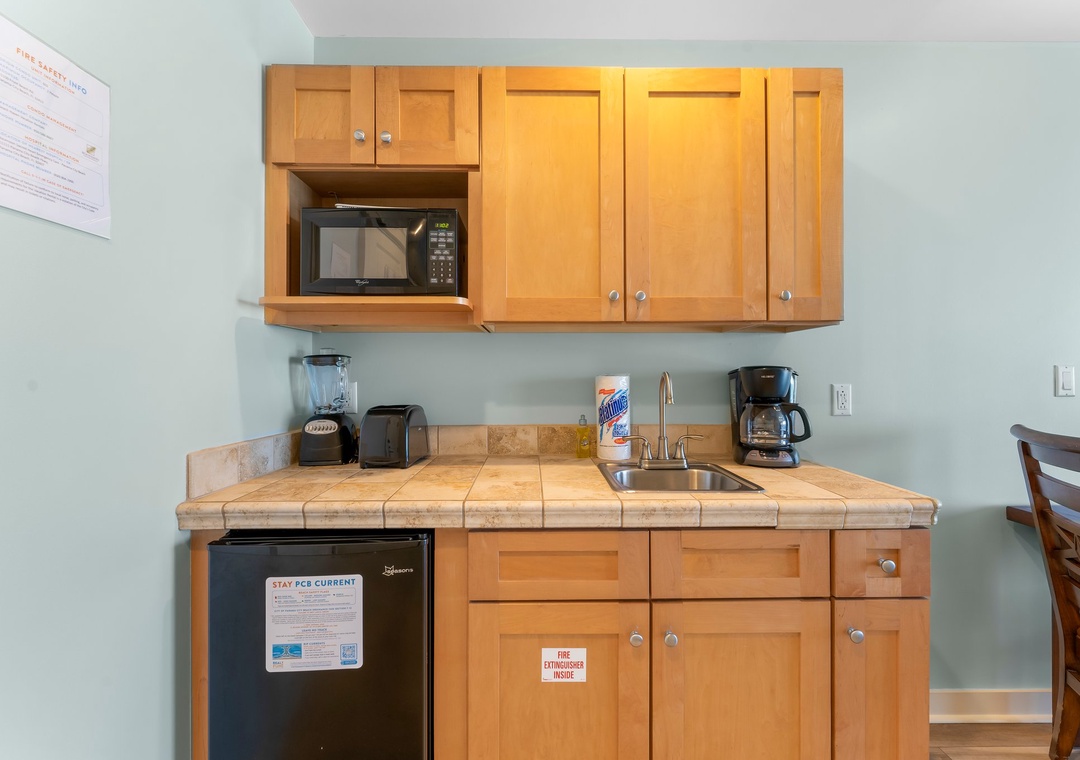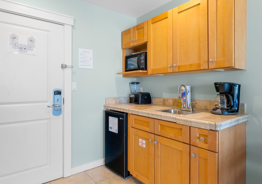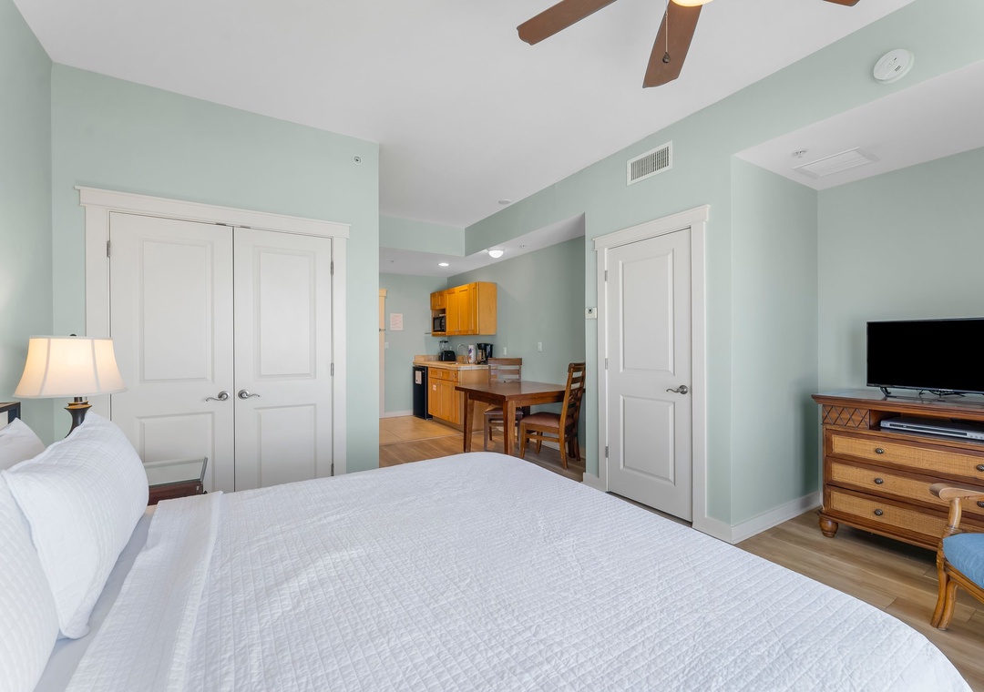 Studio units include one king bed, a mini-refrigerator, microwave, sink, coffee maker, 1-flat-screen TV, 1-bath with a full-size tub and shower unit, as well as private beach access and covered parking.
