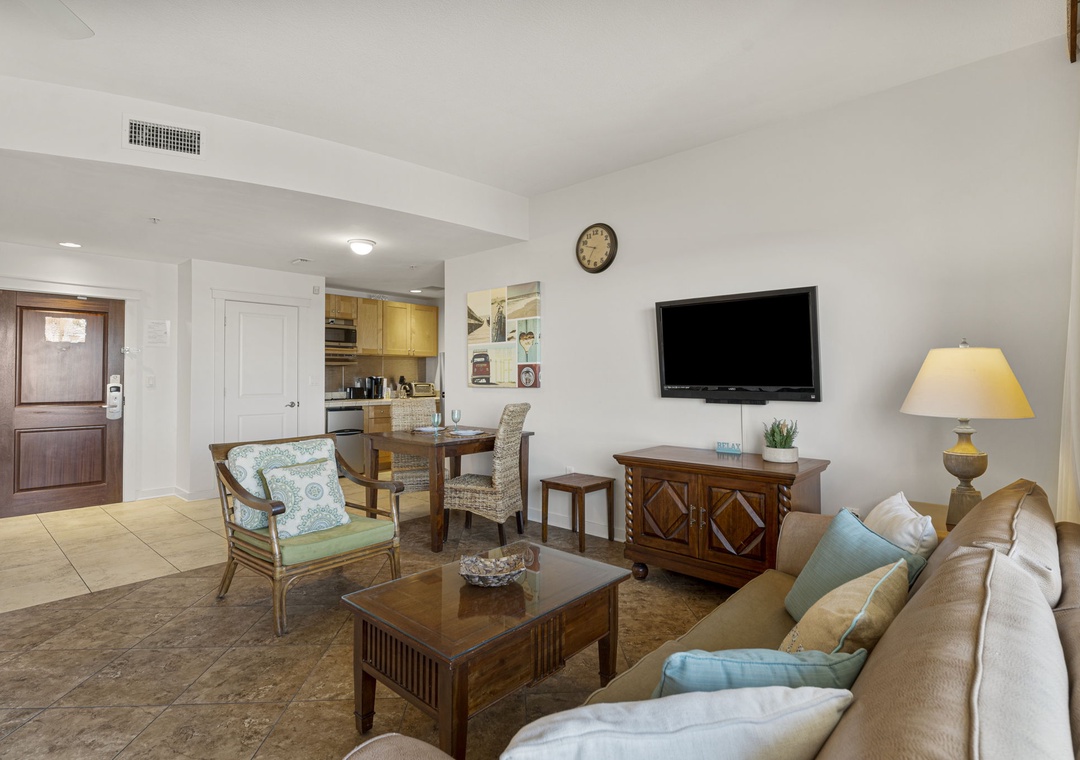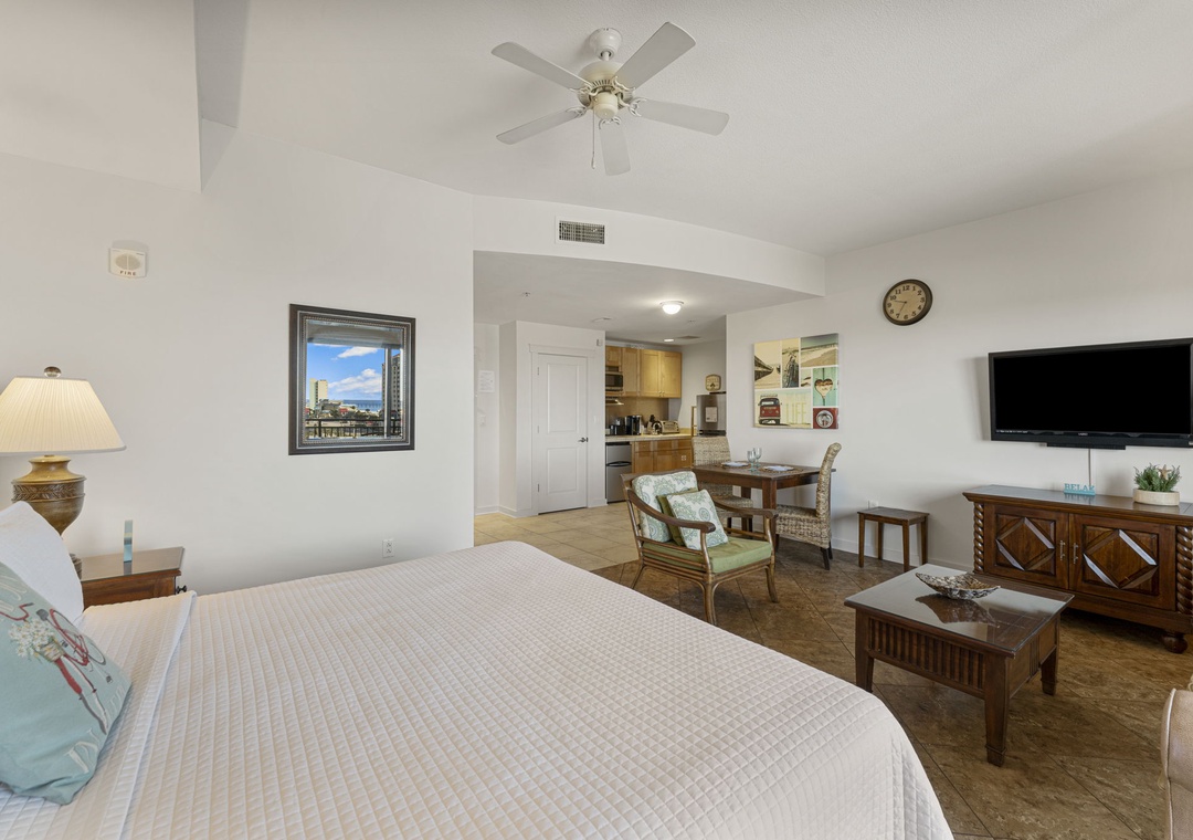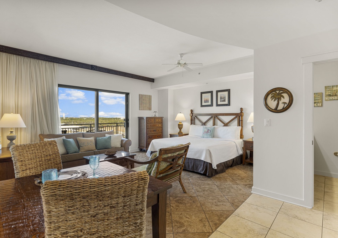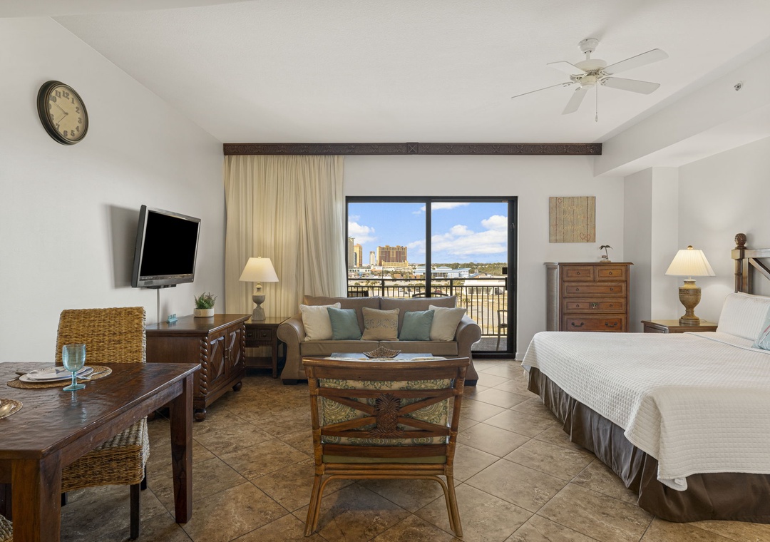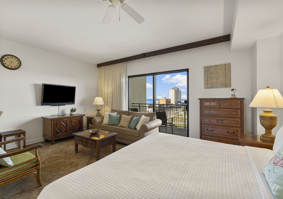 Studio King condo units include one king bed, a pull-out sofa sleeper, a living and dining area with a Full size AND mini-refrigerator, microwave, sink, coffee maker, 1-flat-screen TV, 1-full bath, as well as private beach access and covered parking.