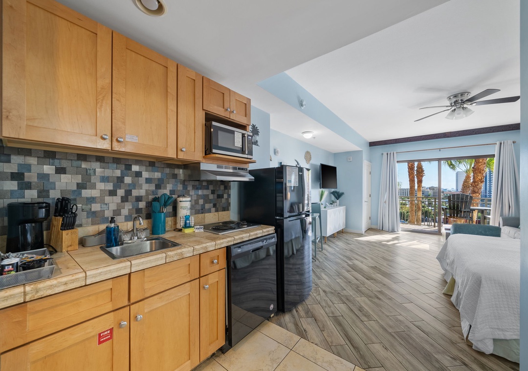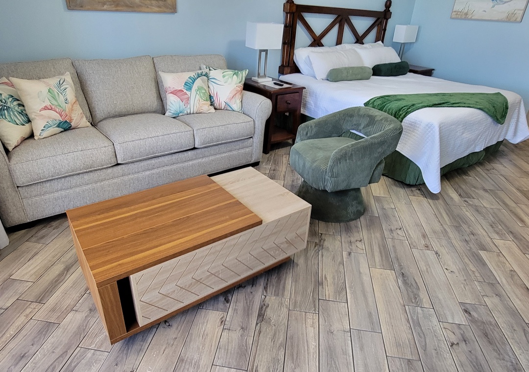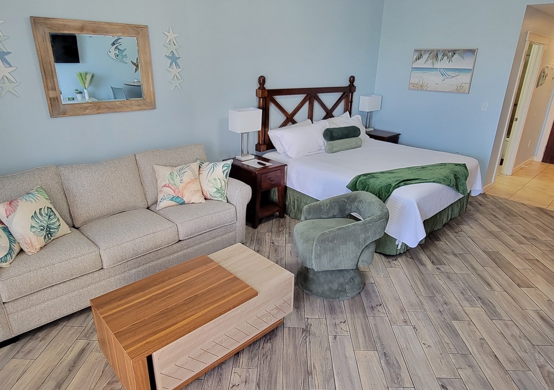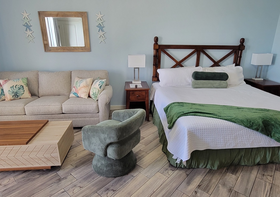Studio King condo units include one king bed, a pull-out sofa sleeper, a living and dining area with a FULL size - refrigerator, dishwasher, microwave, sink, coffee maker, 1-flat-screen TV, 1-full bath, as well as private beach access and covered parking.