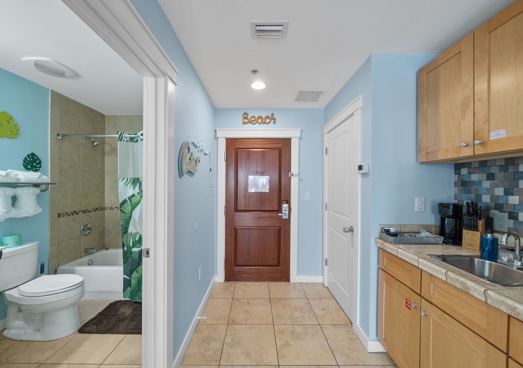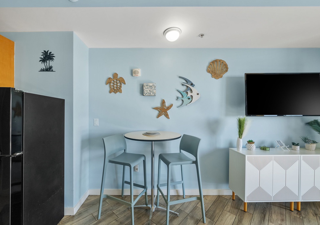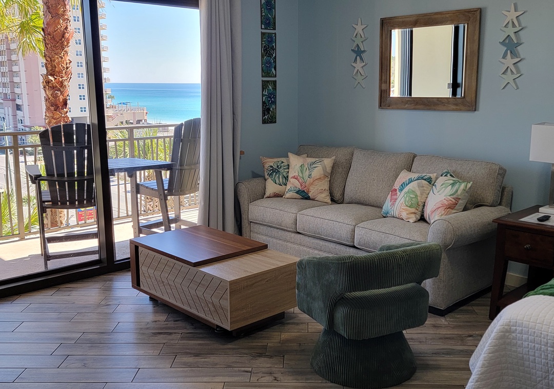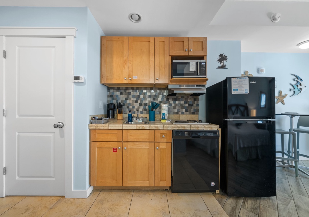 Studio King condo units include one king bed, a pull-out sofa sleeper, a living and dining area with a FULL size - refrigerator, dishwasher, microwave, sink, coffee maker, 1-flat-screen TV, 1-full bath, as well as private beach access and covered parking.