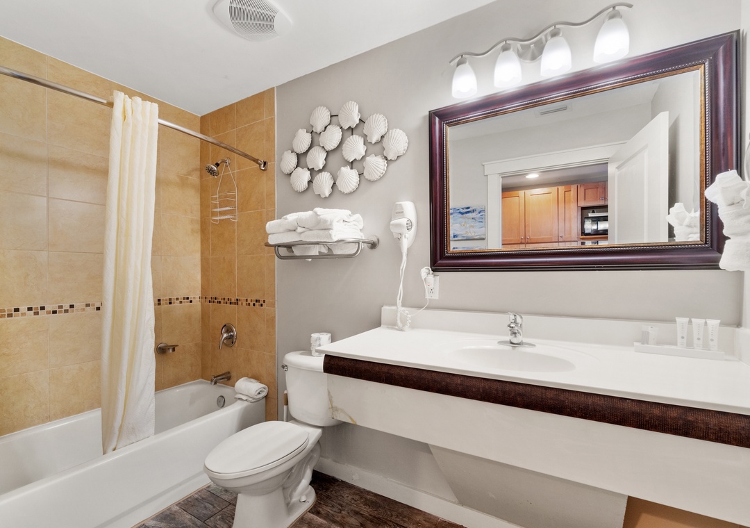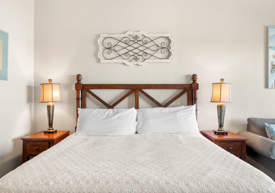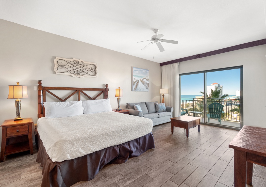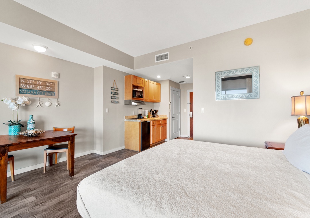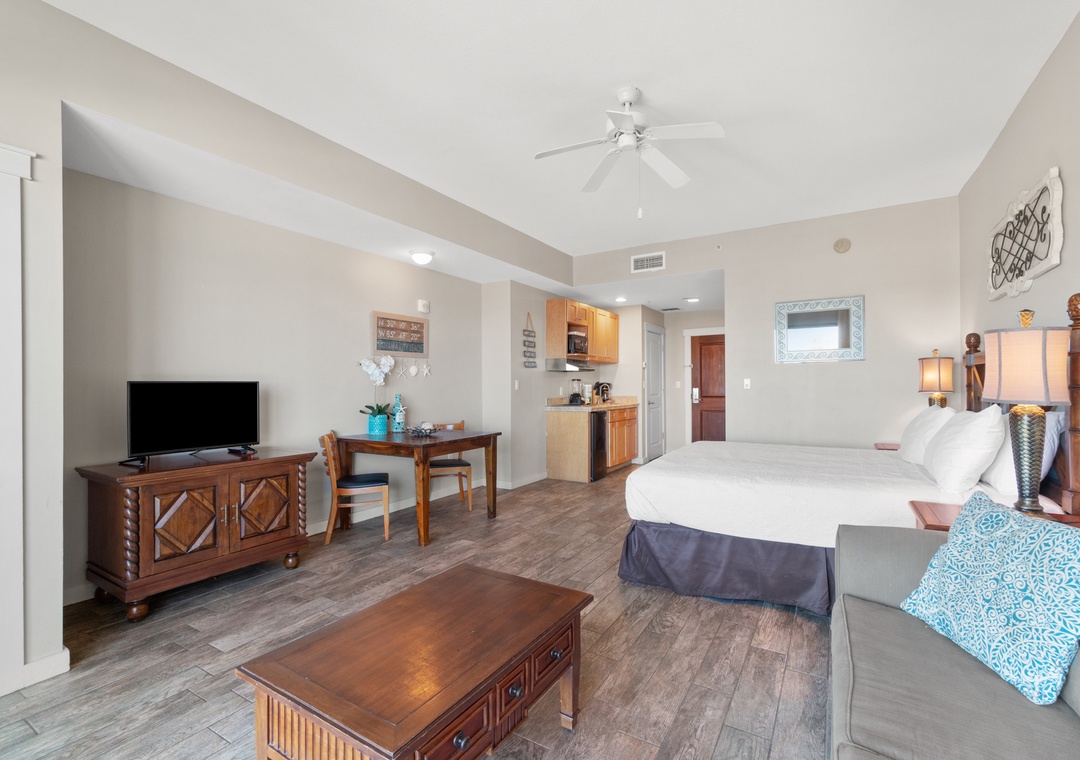 Studio King condo units include one king bed, a pull-out sofa sleeper, a living and dining area with a mini-refrigerator, microwave, sink, coffee maker, 1-flat-screen TV, 1-full bath, as well as private beach access and covered parking.