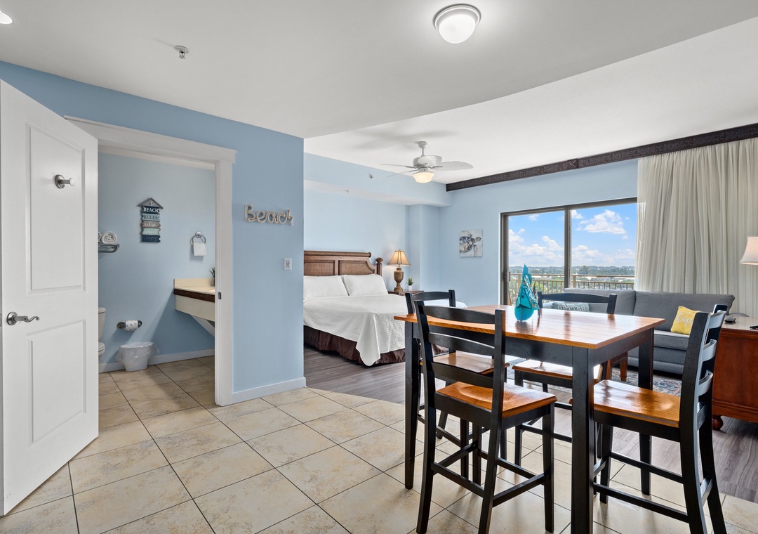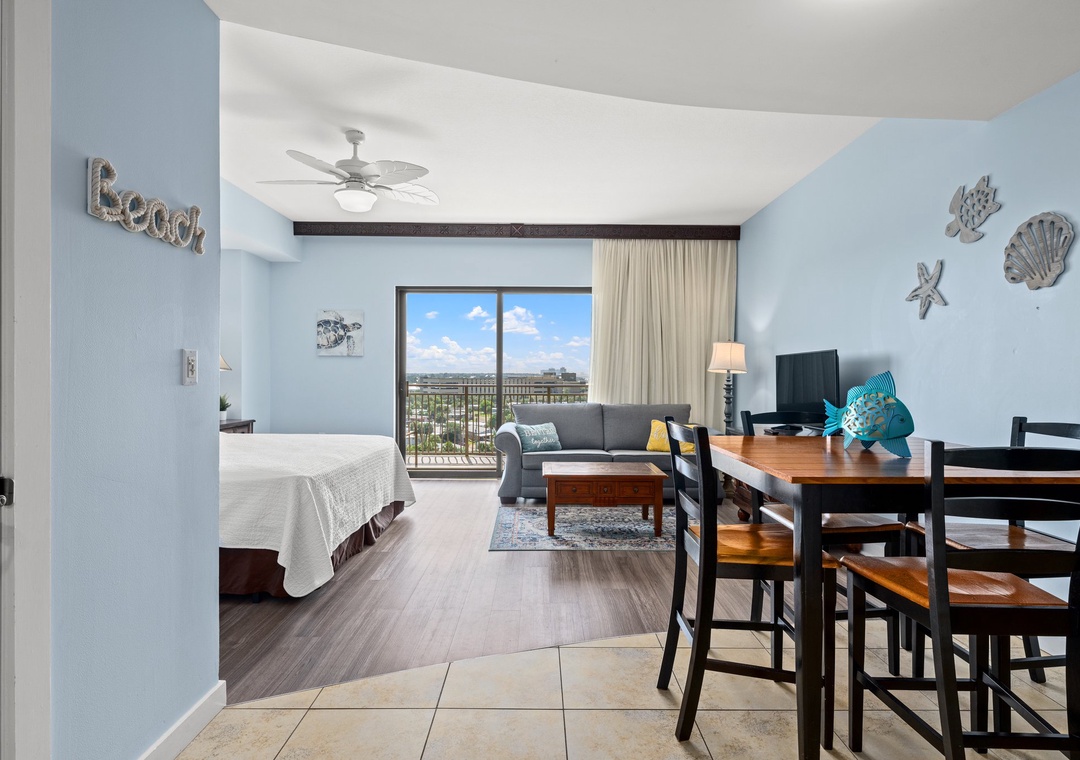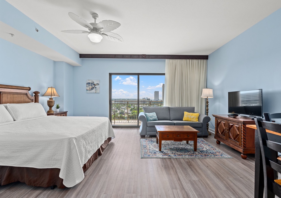 Studio King condo units include one king bed, a pull-out sofa sleeper, a living and dining area with a mini-refrigerator, microwave, sink, coffee maker, 1-flat-screen TV, 1-full bath, as well as private beach access and covered parking.