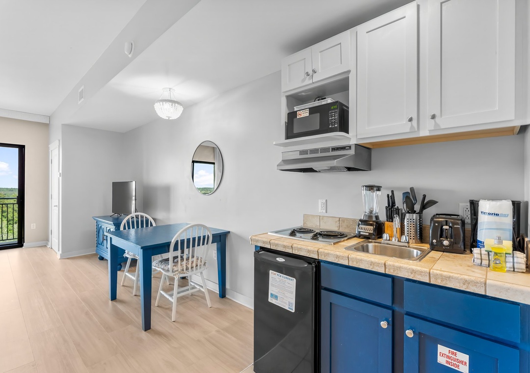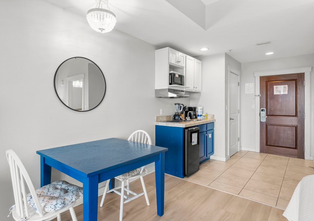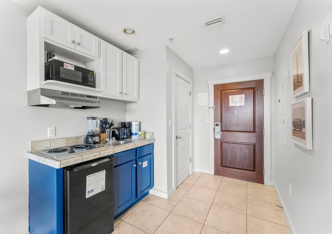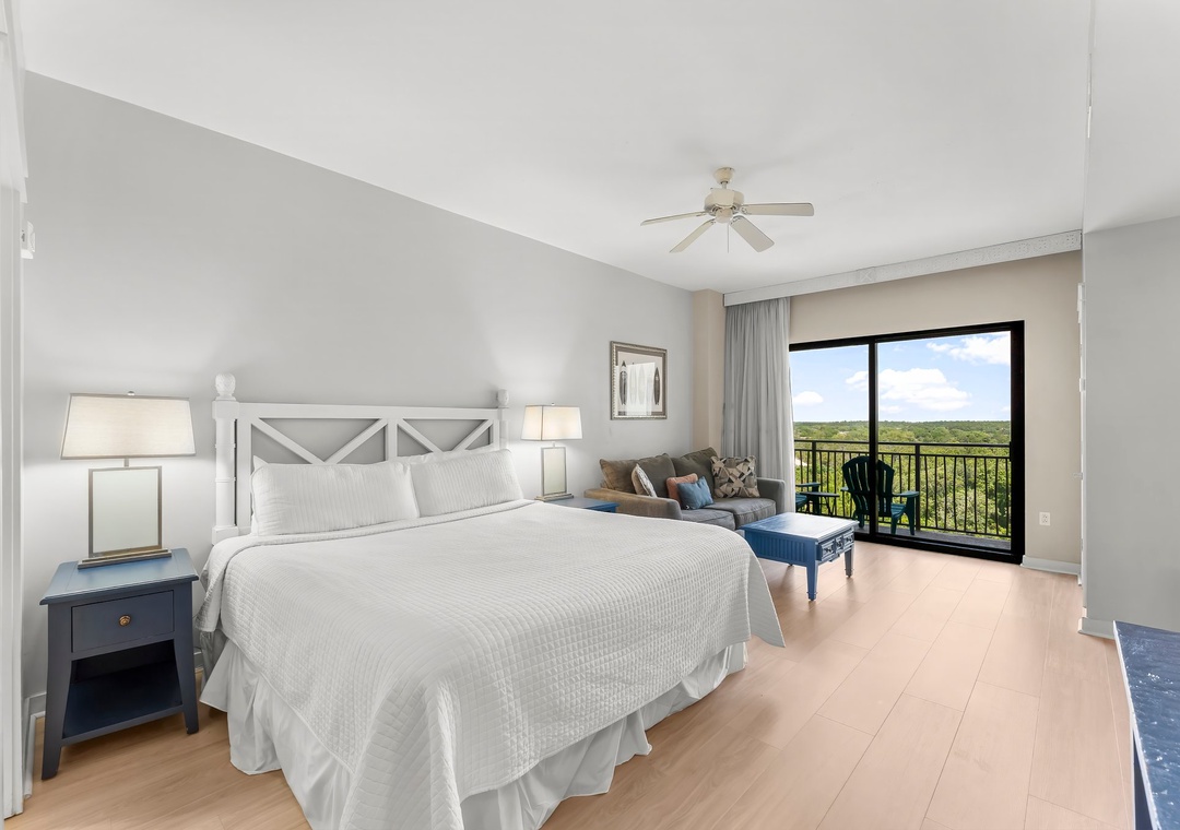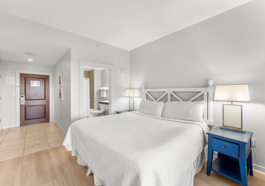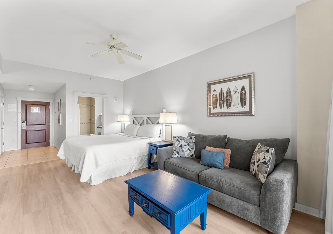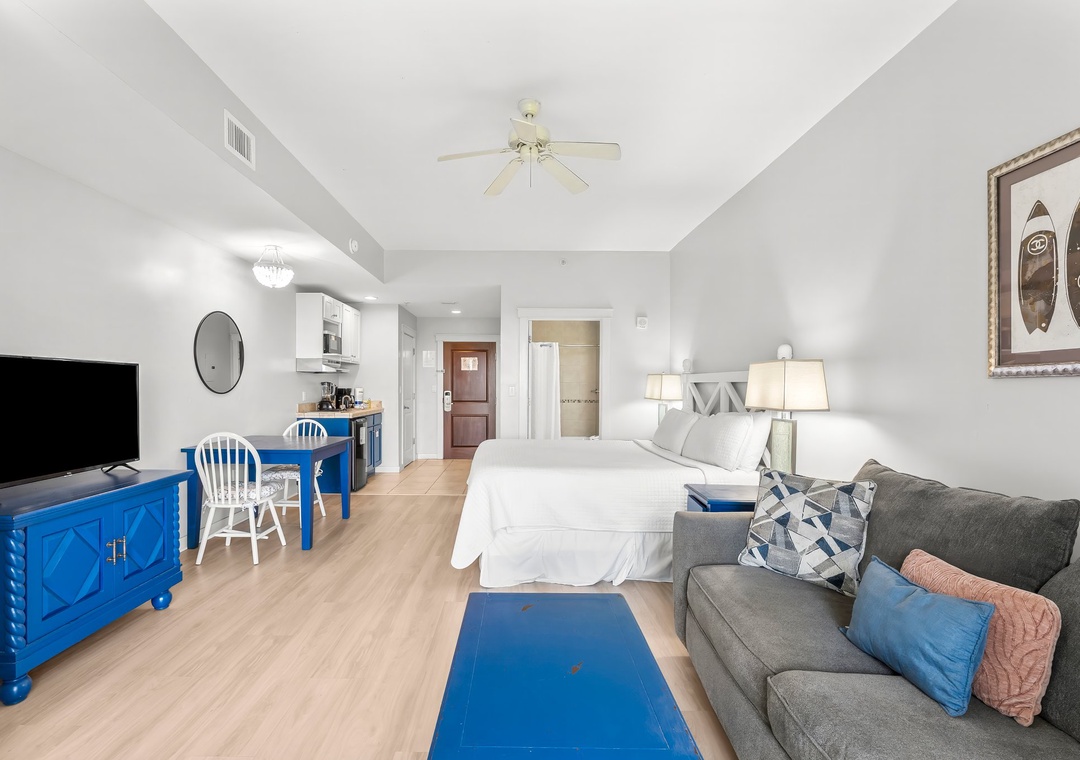Studio King condo units include one king bed, a pull-out sofa sleeper, a living and dining area with a mini-refrigerator, microwave, sink, coffee maker, 1-flat-screen TV, 1-full bath, as well as private beach access and covered parking.