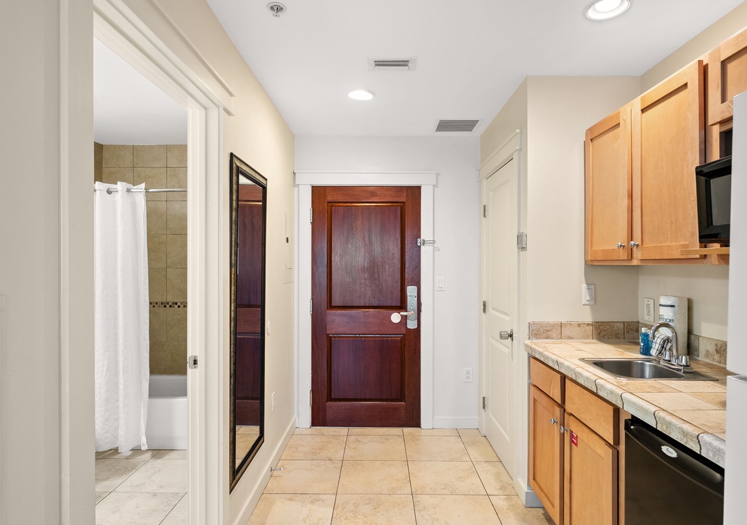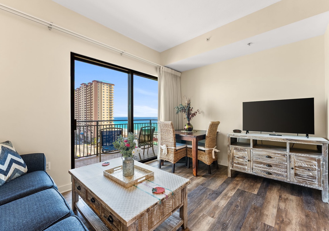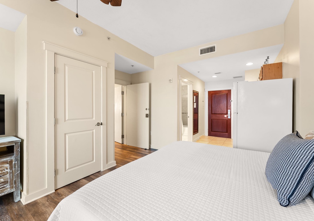 Studio condo units include one king bed, a pull-out sofa sleeper, a living and dining area with a mini-refrigerator, microwave, sink, coffee maker, 1-flat-screen TV, 1-full bath, as well as private beach access and covered parking.