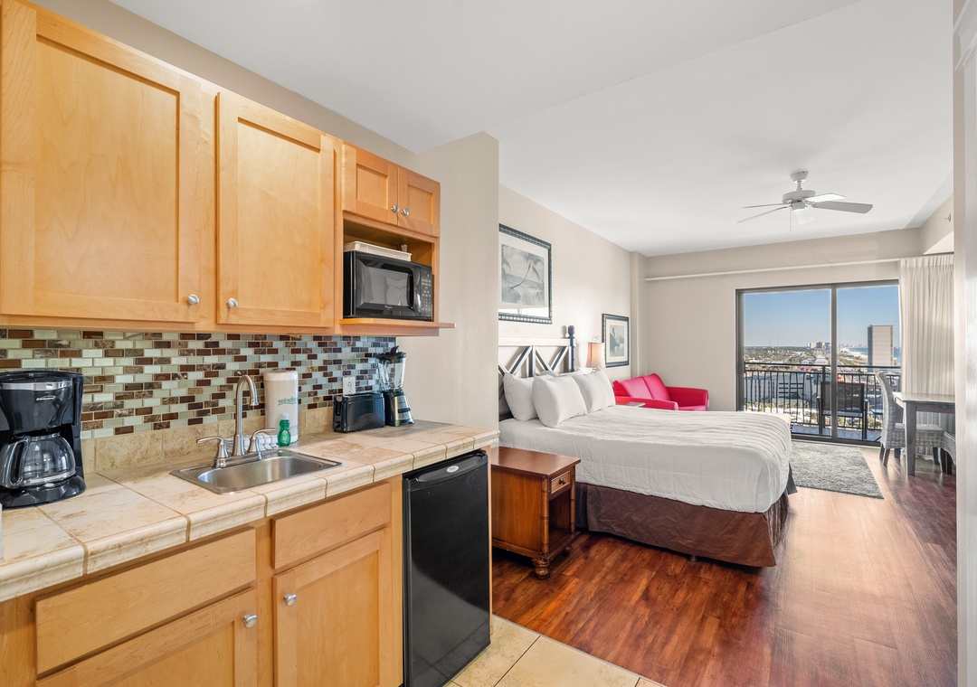Studio units include one king bed, a mini-refrigerator, microwave, sink, coffee maker, 1-flat-screen TV, 1-bath with a full-size tub and shower unit, as well as private beach access and covered parking.
